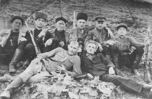 Во втором ряду полулежат, слева -- Ганишев Абдул-Керим (Хилдехьаро, Серноводск) и справа -- Дуишвили Магомед (Дишни, посредник в переговорах с властями, который, по информации, дошедшей до наших дней от самих участников этих событий, был предложен властям в посредники самими повстанцами).