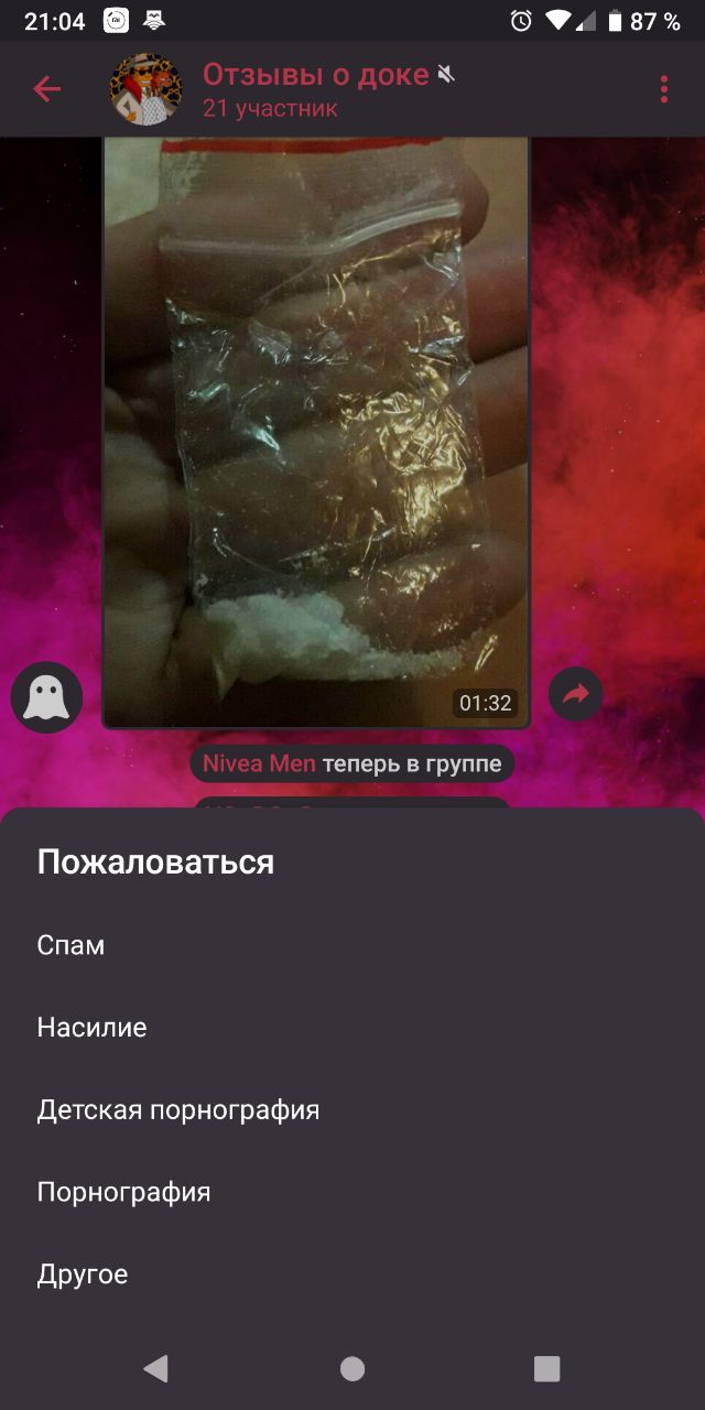 Впрочем, поговорим про это отдельно. Немного позже. А сейчас обратите внимание на скрин снизу. Это список жалоб на канал, чат или аккаунт в телеграм. И подумайте, почему в этом меню нет пункта — “Наркотики”? Это крайне странно, не находите?