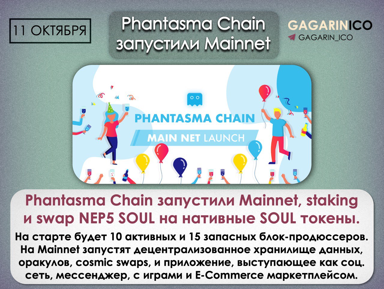 Кроме Mainnet, запустили staking и swap NEP5 SOUL на нативные SOUL токены. На старте будет 10 активных и 15 запасных блок-продюссеров, которые в будущем будут выбираться голосованием.