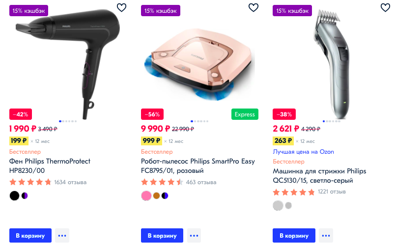 каталога Philips. Фены, пылесосы, электробритвы, и другая техника. Помимо скидки вы получаете кешбэк в размере 15% баллами OZON.