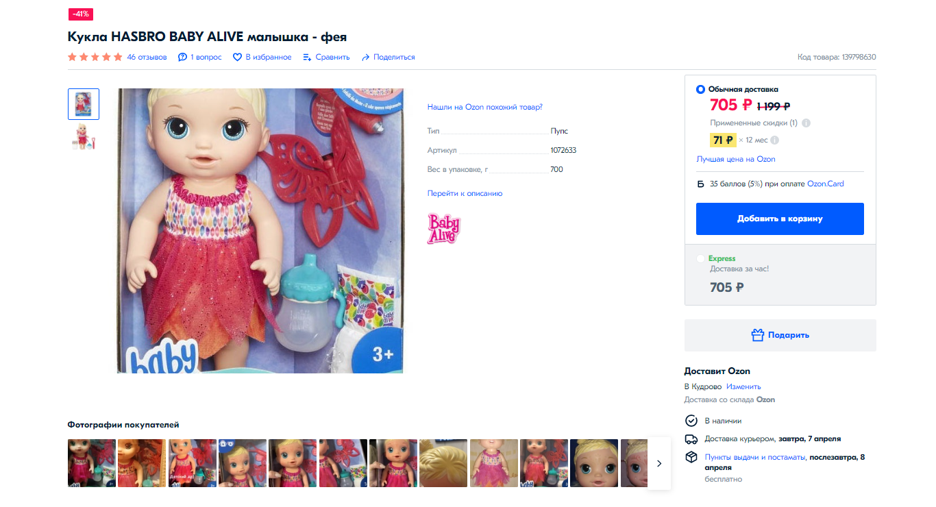 ▫️ Кукла HASBRO BABY ALIVE Малышка фея за 705р. Кукла понравится и девочкам, и мальчикам. Ребёнок сможет кормить куклу из бутылочки, менять подгузники, готовить её к занятиям в школе и многое другое. С помощью специального маркера можно сделать праздничный аквагрим для малышки. В других магазинах от 1490р. Промокод