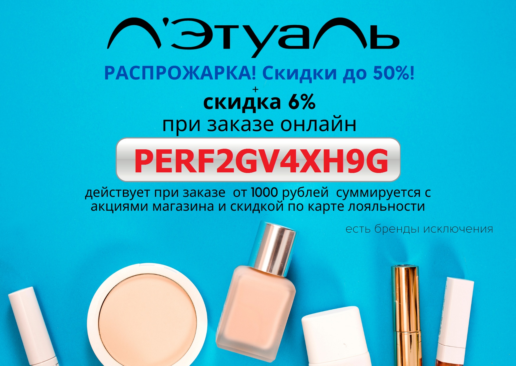 Советую заглянуть в интернет-магазин Л'Этуаль, сейчас там проходит Распрожарка со скидками до 50%. Здесь средства для макияжа, парфюм, уходовые продукты и не только. Кроме того, делюсь промокодом, который скинет ещё 6% от стоимости, в добавок он суммируется с другими акциями. Только сработает промик на заказ от 1000р. и с онлайн-оплатой. Радуем себя или подбираем подарок своим близким.