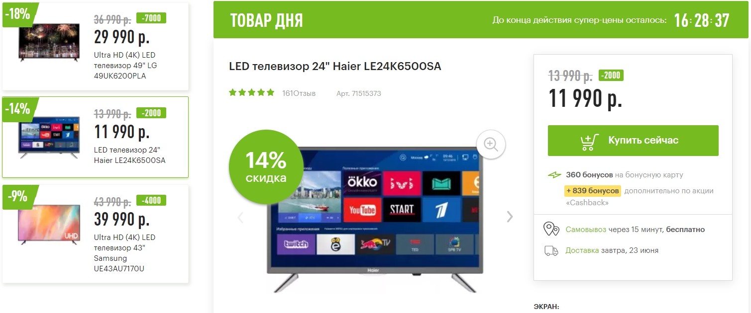 Доброе утро! Лови подборку товаров дня по сниженным ценам: телевизоры, инструменты, товары для спорта и дома. Оплачивай до 50% покупок бонусными баллами в корзине и экономь еще больше.