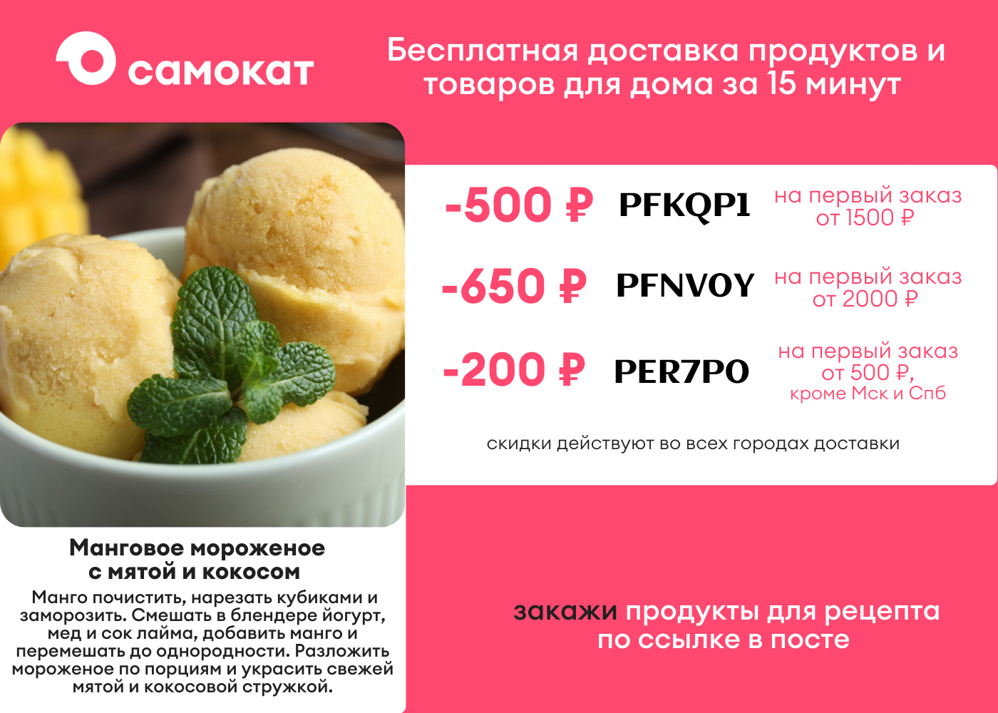 🔥Скидка по промикам суммируется со скидками и акциями в приложении. Но применить их можно только на первый заказ.