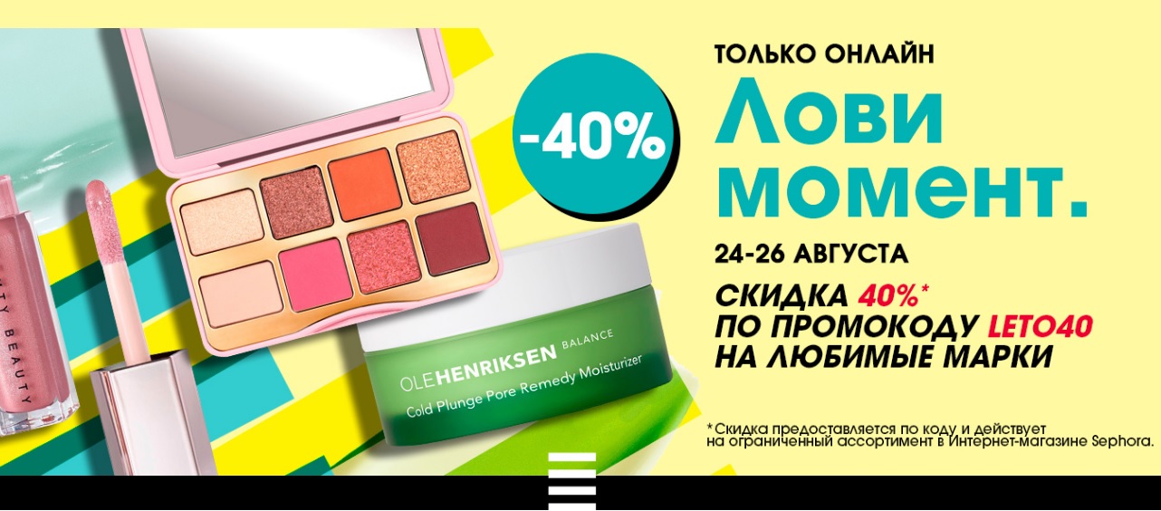 ▫️Только сегодня есть возможность воспользоваться акцией "Лови момент" и забрать популярные продукты для макияжа, уходовые средства и любимые ароматы с фиксированной скидкой 40%. Для этого просто переходи на страницу акции, наполняй корзину и применяй промокод: