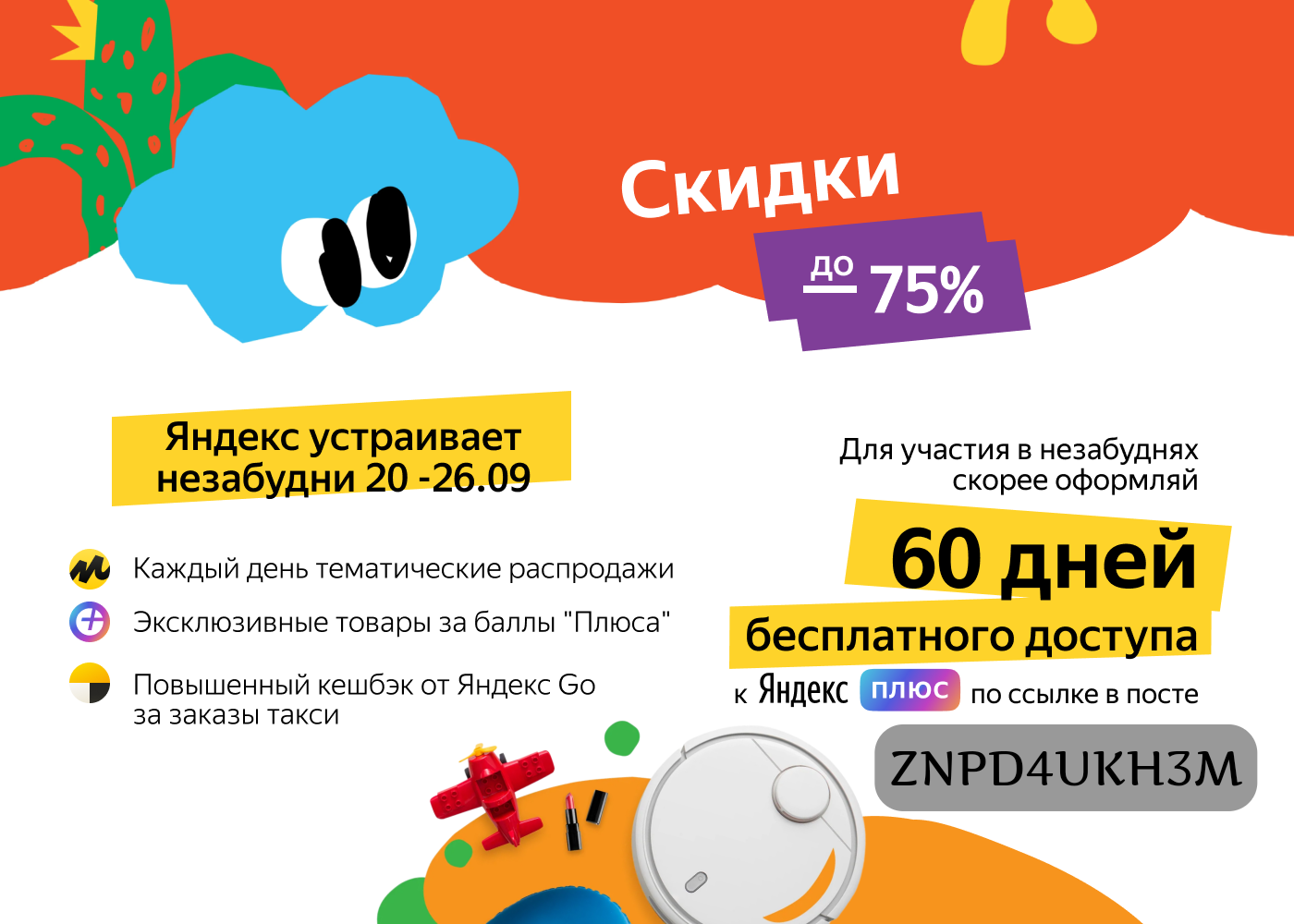 • Яндекс GO - 10% кешбэк баллами за поездки в классах «Комфорт», «Комфорт+» и Ultima.