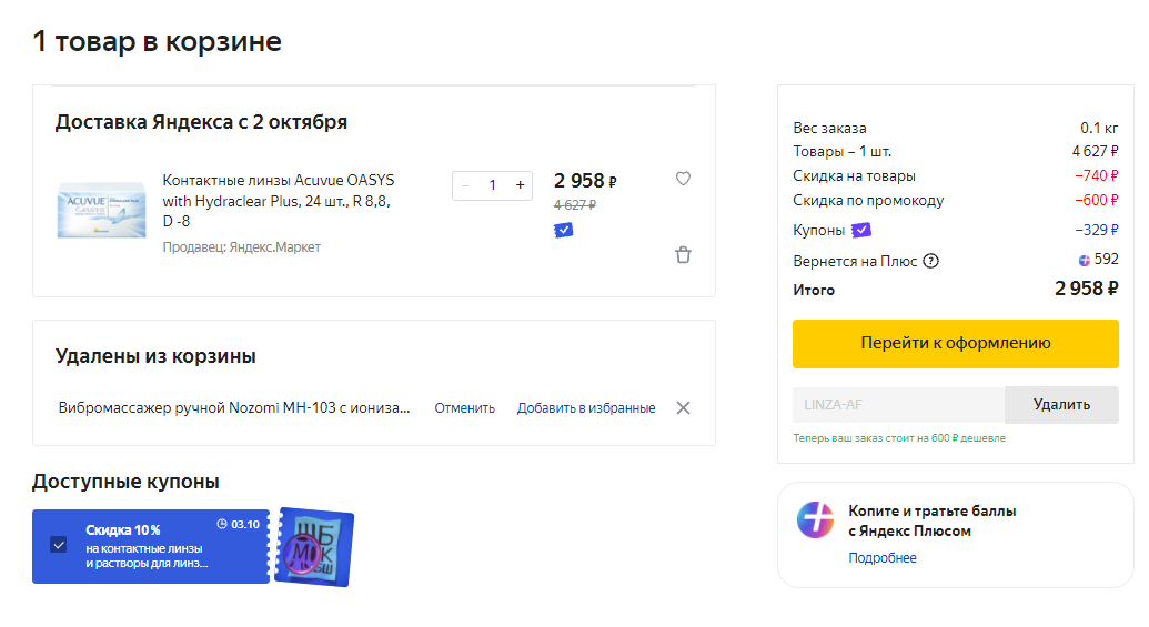 LINZA-AF на скидку 600р. от 2500р. Ощущаешь выгоду?? Для наглядности пример: Контактные линзы Acuvue OASYS with Hydraclear Plus, 24 шт., R 8,8, D -8 будут стоить всего 2958р2958р. вместо 4627р.Делимобиль