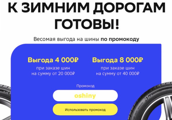 ▫️Видел цены на зимние шины? Вот и я немного в шоке, но покупать надо, что поделать. И все-таки выход есть - нашел промик на шины и диски, с которым можно неплохо сэкономить! Он даст скидку 4000р. при покупке от 20000р, либо скинет 8000р, если наберешь корзину на 40000р. Для этого перед заказом вводи: