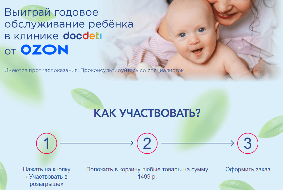 ✔️Розыгрыш годового обслуживания ребенка в клинике DocDeti! Классное предложение от клиники доказательной медицины - можно выиграть одну из 10 годовых программ обслуживания для деток. Порядок действий очень прост: нажимай на кнопку «Участвовать в розыгрыше», клади в корзину любые товары на сумму от 1499р, оформляй заказ и всё - шанс на выигрыш твой! Перед заказом всегда вводи промокод: