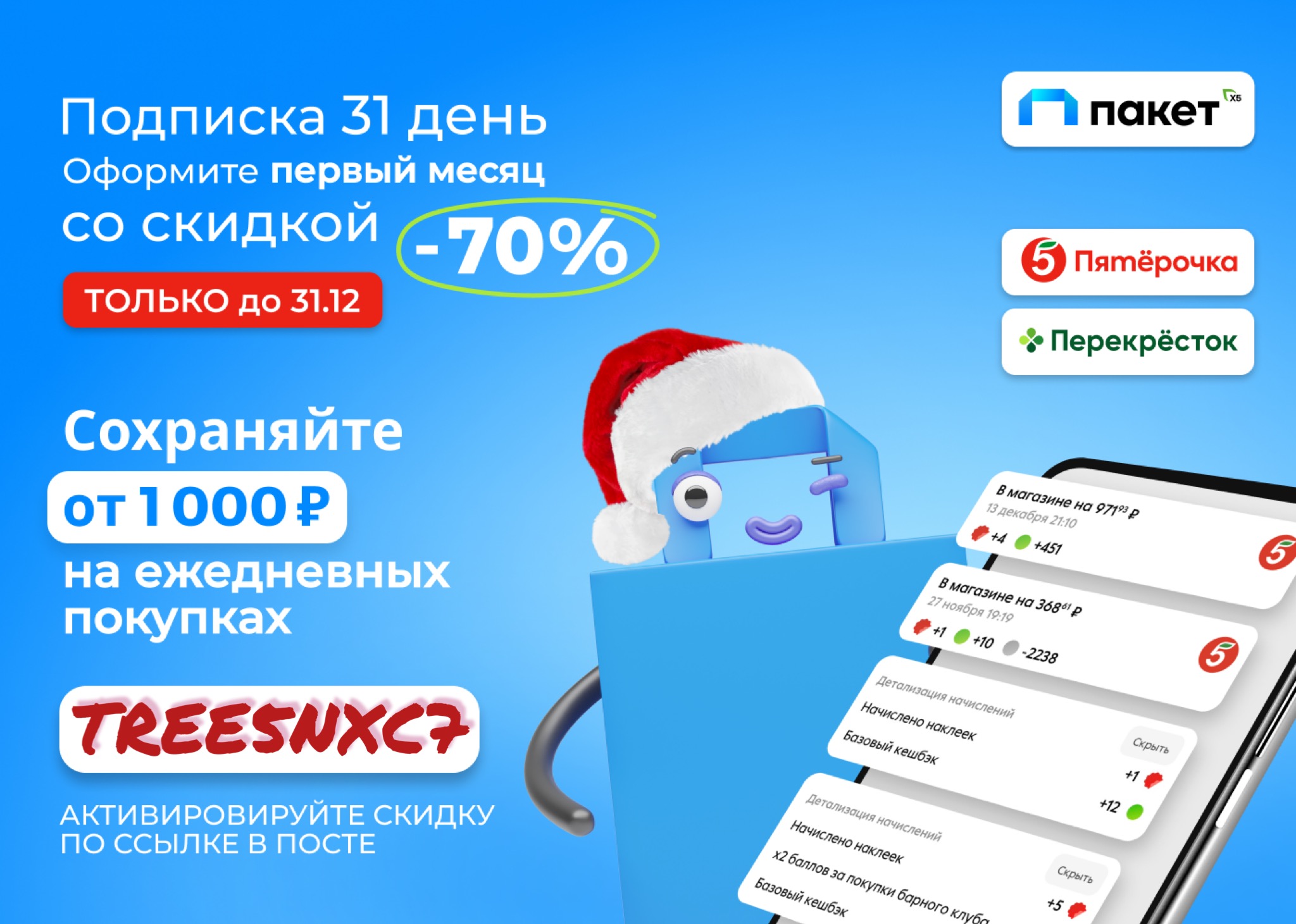 70% на первый месяц по промокоду! Еще недавно скидка была 50%, а сейчас нас порадовали щедрым предложением к новому году! Не тяни с оформлением подписки, нужно успеть до 31 декабря. Обычная цена каждого пакета 199р, 249р. и 299р, но по себе знаю, что стоимость окупается с одной закупки в Пятерочке или Перекрестке. Я, кстати, уже не первый месяц пользуюсь подпиской, только и успеваю баллы списывать😉 У Пакета от Х5 Group много классных плюшек, расскажу о них подробнее.