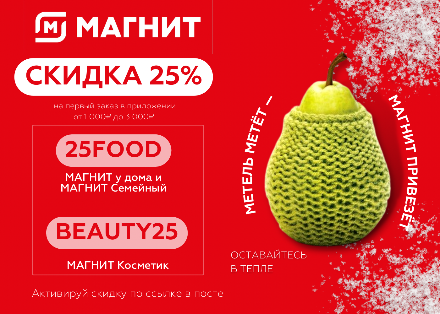 25FOOD - скидка 25% от 1000р. до 3000р. в Магнит у дома💄