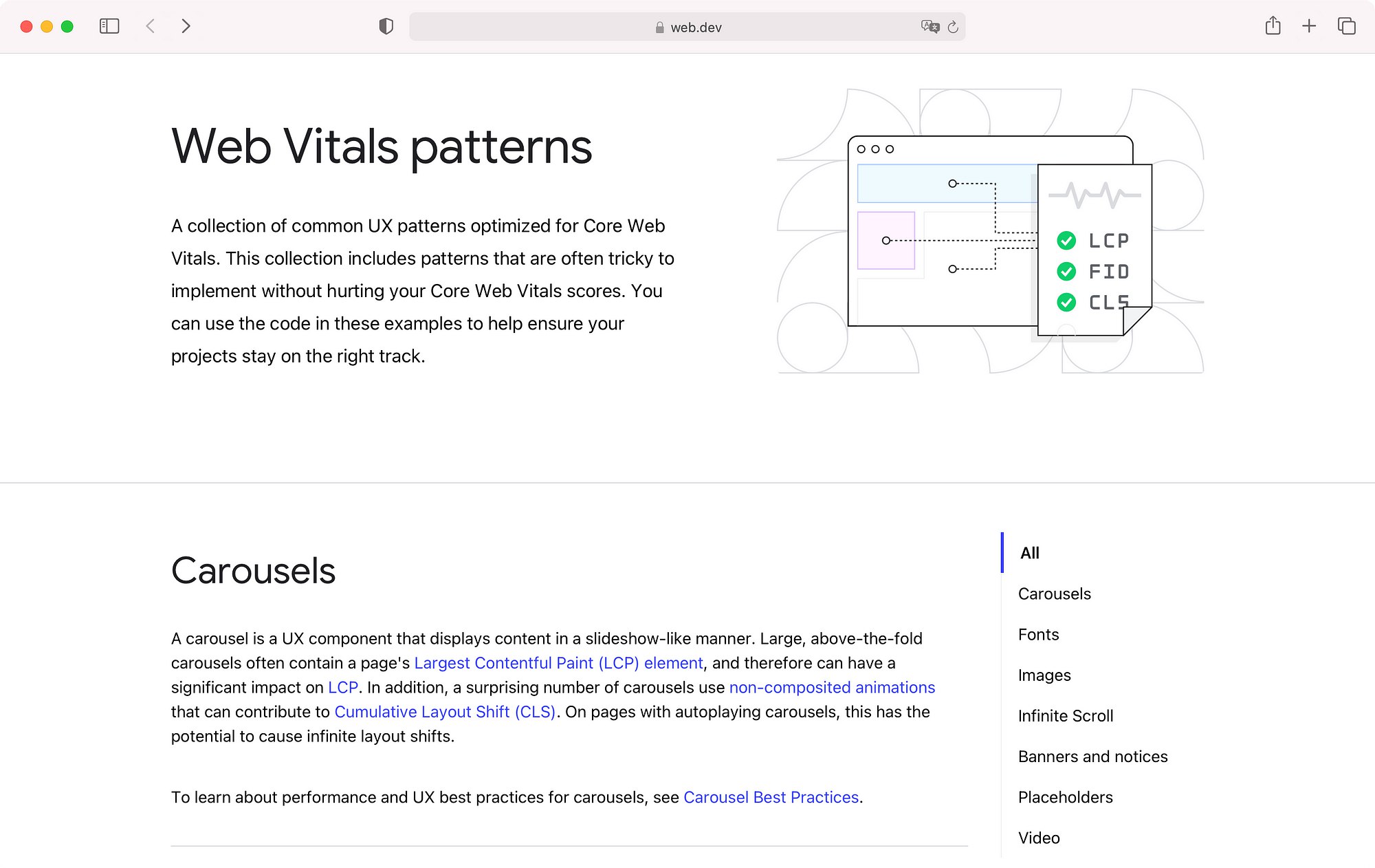 Паттерны Web Vitals: коллекция примеров и рекомендаций по реализации UX-паттернов, которые могут негативно повлиять на метрики Web Vitals. Карусели, кастомные шрифты, бесконечная прокрутка, видео и другие паттерны → https://web.dev/patterns/web-vitals-patterns/