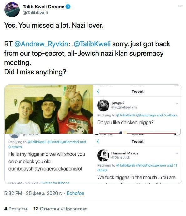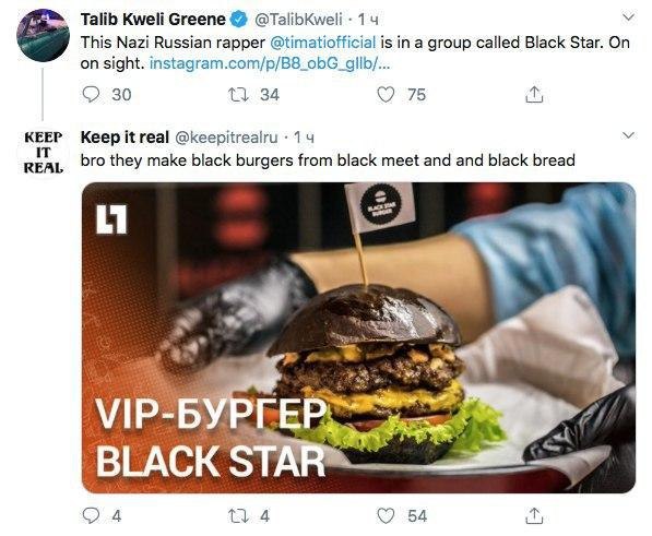Талиб — отличный пример того, как хороший исполнитель вдруг решает, что он мессия и его задача на этой планете — больше, чем просто читать рэпчик. Он давно борется с «белым превосходством» и видит нацистов буквально под каждым диваном. Ну а пару дней назад в Twitter, где у него больше миллиона подписчиков, к рэперу пришёл его русский коллега I1 и на хорошем английском попытался объяснить, что война с расизмом — это не наша война. В России не было чёрных рабов, не было колоний, а в рабстве до 1861 года были свои же сограждане.