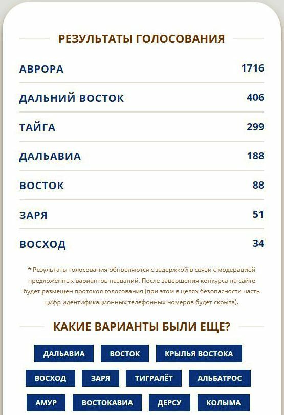 aviadv.ru - почему в предложенных вариантах чётко обозначены Аврора, Тайга и Дальний Восток? Многие голосуют с мобильных устройств и разбираться как напечатать свой вариант нет возможности или нет времени. Пускай организаторы добавят все варианты по которым уже сейчас появилась активность.