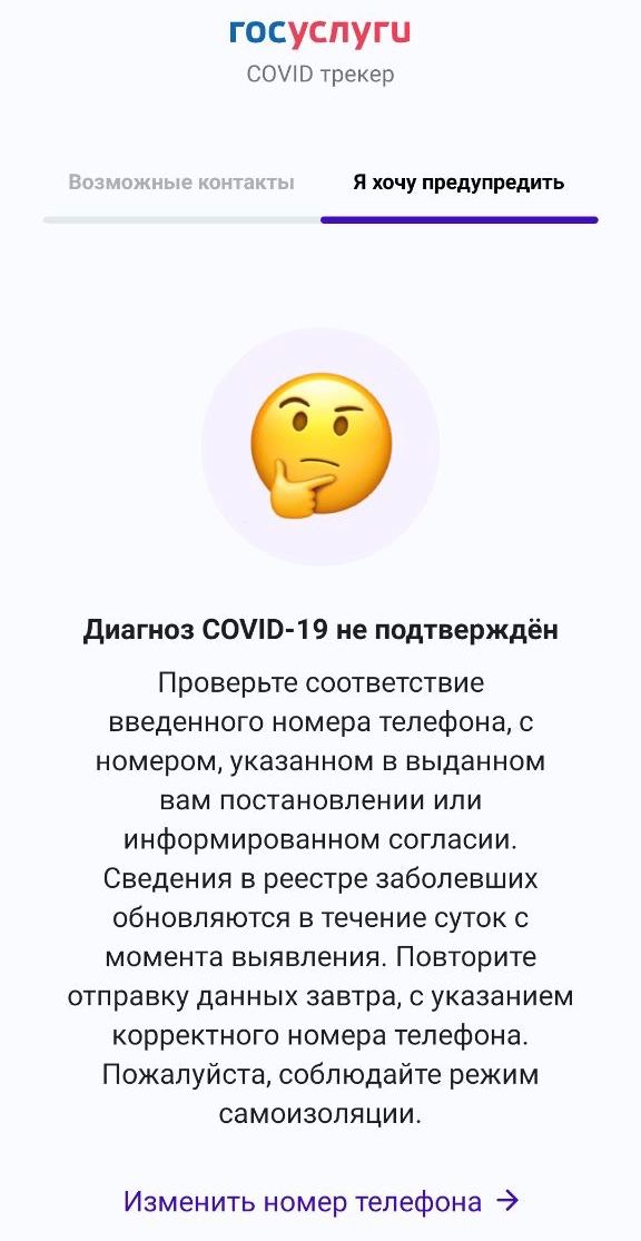 Странность и одновременно провал - чтобы отметить себя как заболевшего, нужно быть официально быть признанным таковым Роспотребнадзором. Пользователю нужно ввести номер телефона, который бьется с базой ведомства (указанный в постановлении об изоляции). Только вот незадача - в регионах постановления давно выдавать перестали, а результаты бесплатного теста ждут неделями. Так что возможности добровольно оповестить контактных у больного просто нет. Так и живём.