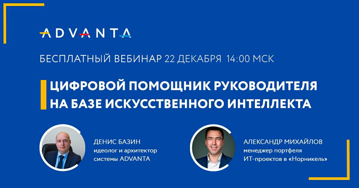 Вебинар «Цифровой помощник руководителя на базе искусственного интеллекта»Когда: 22 декабря (среда) 2021 года,
