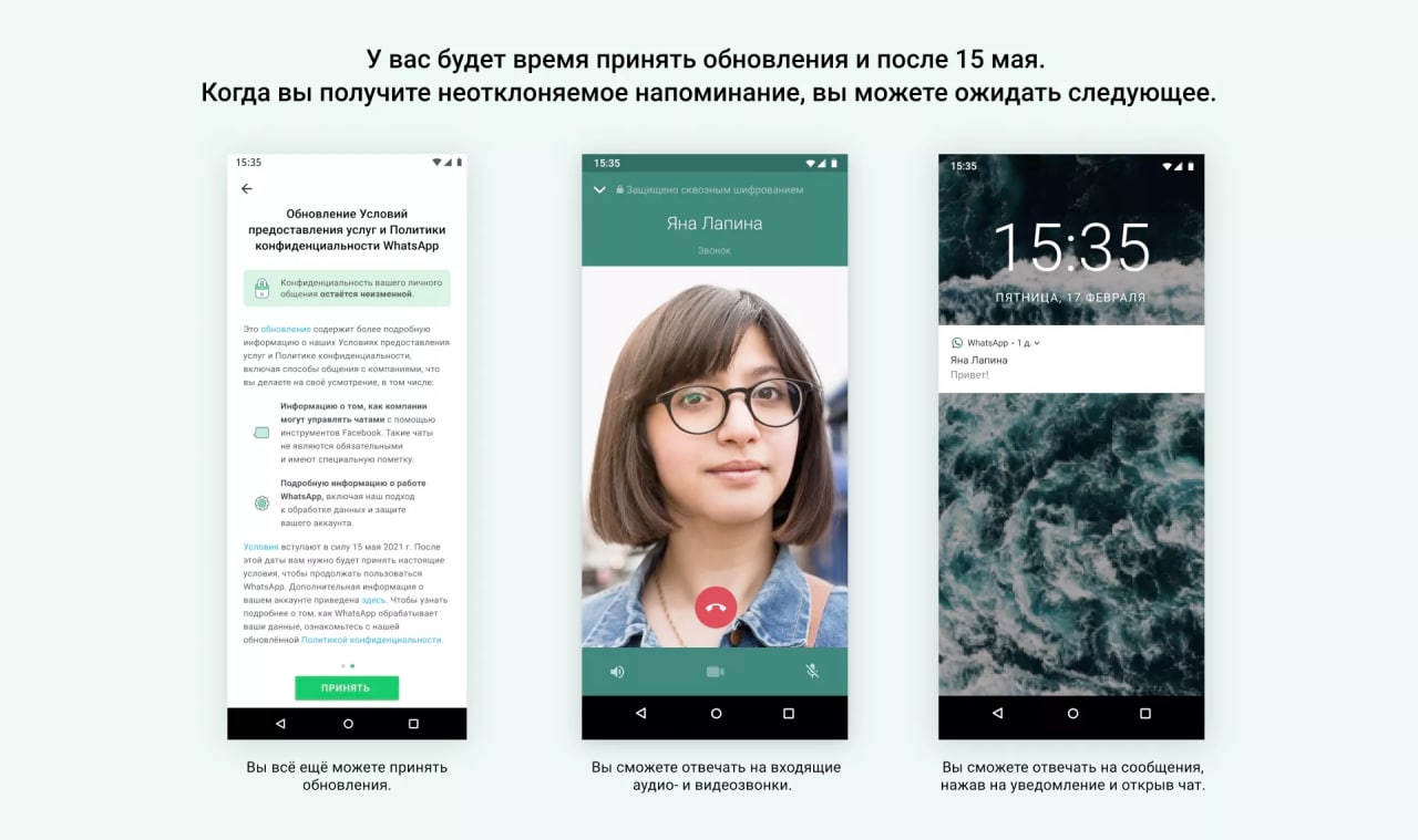 в WhatsApp объявили, что теперь пользователи, которые не примут новые правила конфиденциальности — столкнуться с некоторыми ограничениями.