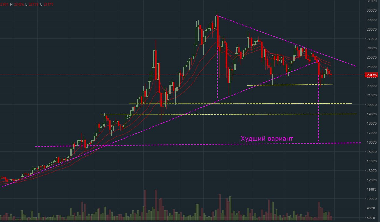 📊📉📈BTC/USD нельзя как я понял уйти в такой момент . Поэтому рассмотрим ситуацию где мы сейчас. Биткоин вышел на нижнюю грань канала (синие линии) Это явный знак закрыться скальперам. Здесь может быть проторговка уровня , либо , если он сильный - пойти наверх в канале. Посмотрим насколько он сильнй и готов удержать в своих рамках биткоин . При слабости, по правилам , мы падаем на всю величину канала, Сосчитайте его высоту и от последей цены опустите её вниз. Там ориентир куда Биткоин МОЖЕТ прийти. Я не знаю что будет разумеется, если кто-то хочет - может купить, если кто-то паникует - выключите компьютер, потом всё будет нормально. Кто хочет купить - определяйте уровни покупок и берегите деньги. Они всегда нужны ......опыт подсказывает)). Спасибо.