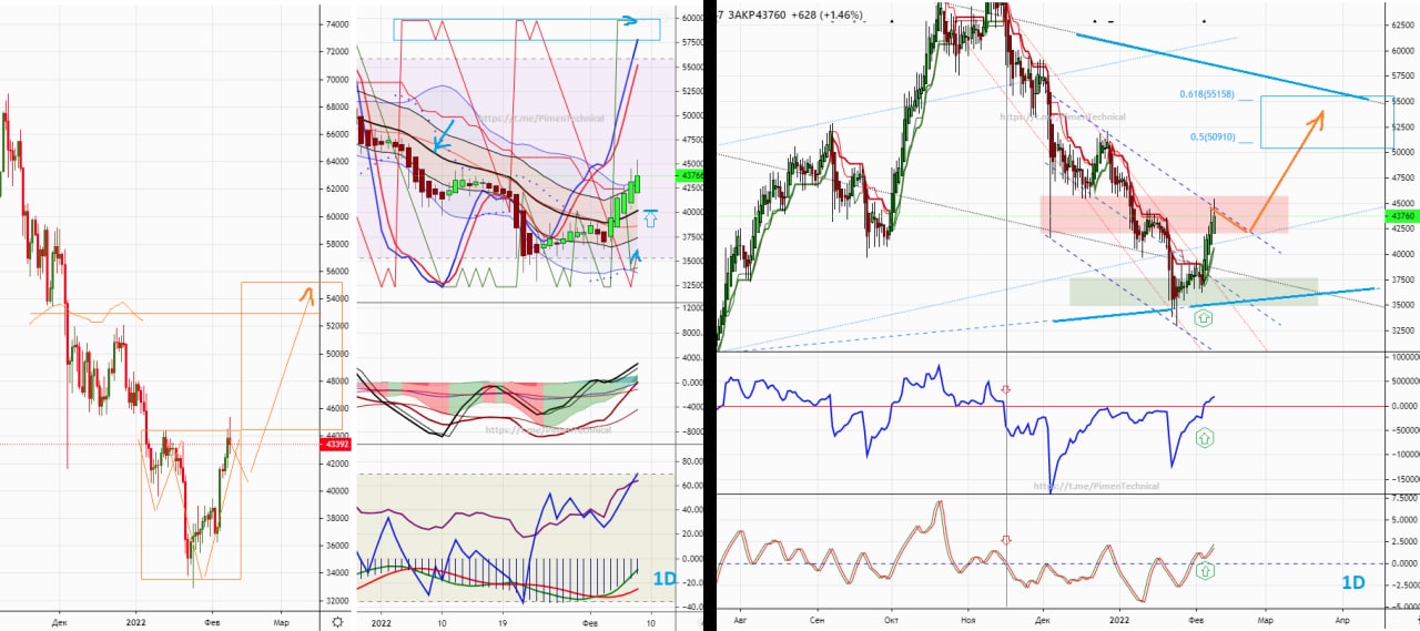 #BTC/USD bitfinex , на 18:42 мск цена у 45615$, Сопротивление  на  которое наткнулись (см.графики за 05-08.02 .2022) тормозит рост, для покупателей всё пока остаётся положительным. Поддержка по дневке снизу в зоне 41000-42000.