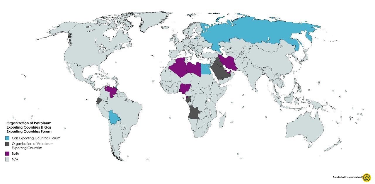 Государства входящие в организации стран экспортеров нефти (ОПЕК) и форум стран экспортеров газа (ФСЭГ) Голуб. - ФСЭГ Темно-серый - ОПЕК Пурпур. - обе организации