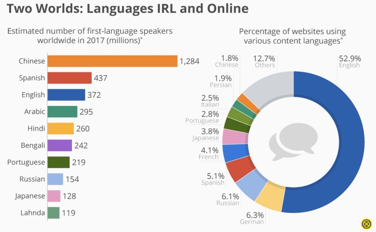 Диаграмма носителей языка в мире и языки веб сайтов. Несмотря на то что китай самый разговорчивый, сайты на их языке занимают всего 1.8% в отличие от 52% на инглише.