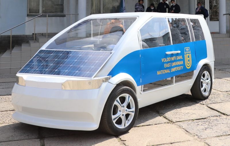 Украинские учёные вместе со студентами ВНУ им. В. Даля создали новый электромобиль "Ева". Изобретение уникально тем, что его кузов сделан из стеклопластика, на крышу и капот можно установить солнечные батареи, а форма кузова удобна для людей с ограниченными возможностями. Представленный макет автомобиля может проехать 100 км со скоростью 80 км/час.