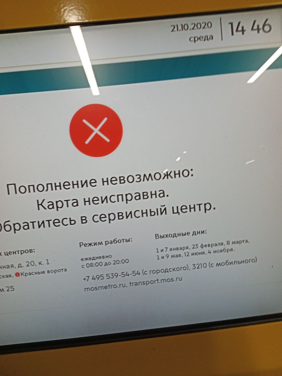 В метро мне тоже жёлтый круг отказал в удаленном пополнении на 1000 рублей, хотя сотрудник МосТранспорта сказал, что видит в резерве 1000, но не понимает почему она не зачисляется