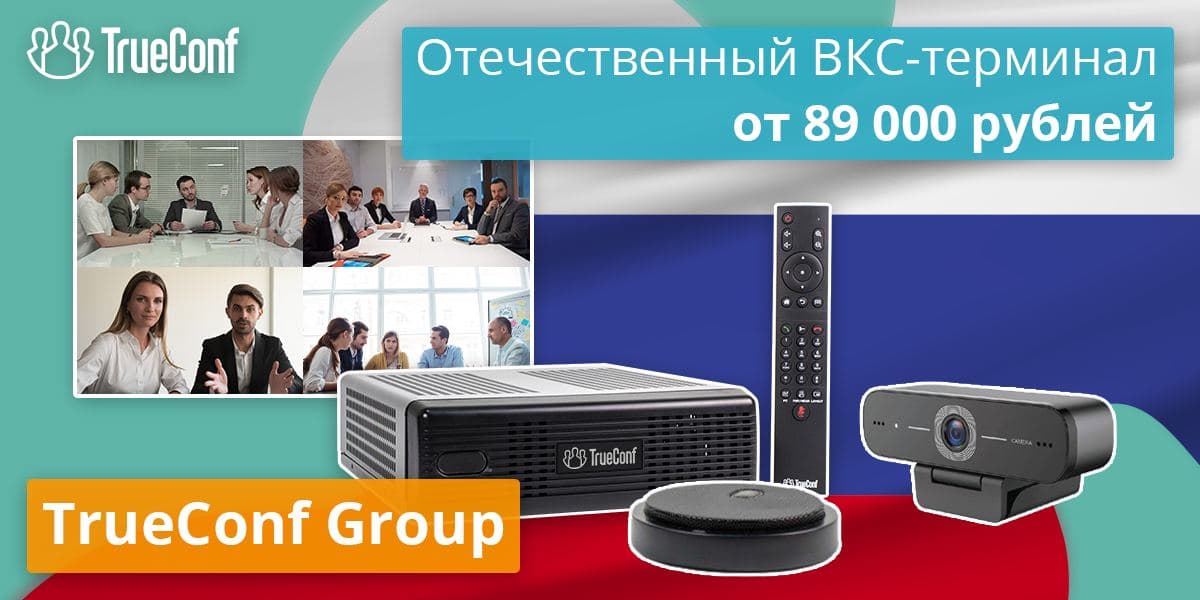 TrueConf Group — самый доступный ВКС-терминал, созданный для полноценной замены зарубежных аналогов. Стоимость стандартной версии с ВКС-кодеком, камерой и микрофоном составляет всего 89 тысяч рублей.