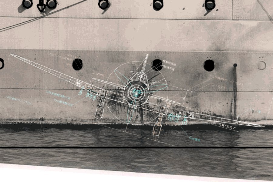"Отпечаток на борту британского тяжелого крейсера HMS Sussex принадлежит разведывательному штурмовику японский армии Ki–51 (кодовое название «Соня»). Боезаряд попал в воду прежде, чем самолет столкнулся с корпусом судна. Самолет можно спутать с бомбардировщиком Aichi D3A, однако при внимательном рассмотрении отпечатка можно заметить отсутствие посадочных огней и иное расположение пушек. "