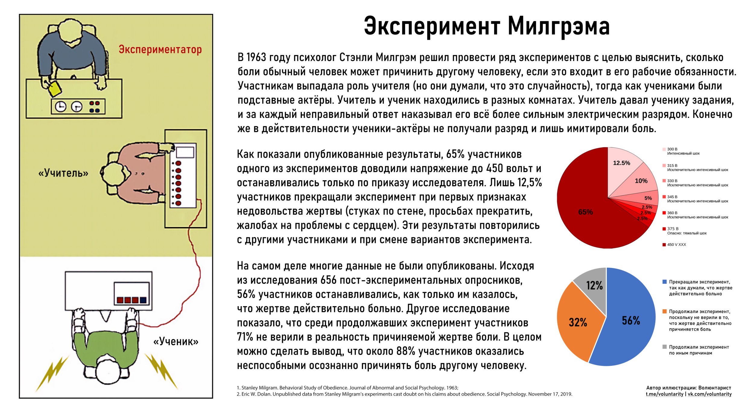 В 1963 году психолог Стэнли Милгрэм решил провести ряд экспериментов с целью прояснить вопрос: сколько страданий готовы причинить обыкновенные люди другим, совершенно невинным людям, если подобное причинение боли входит в их рабочие обязанности? Он хотел узнать, как жители Германии в годы нацизма могли участвовать в уничтожении миллионов невинных людей в концентрационных лагерях.
