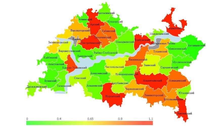 Самый низкий уровень зафиксирован в Кайбицком, Мензелинском и Актанышском муниципалитетах.