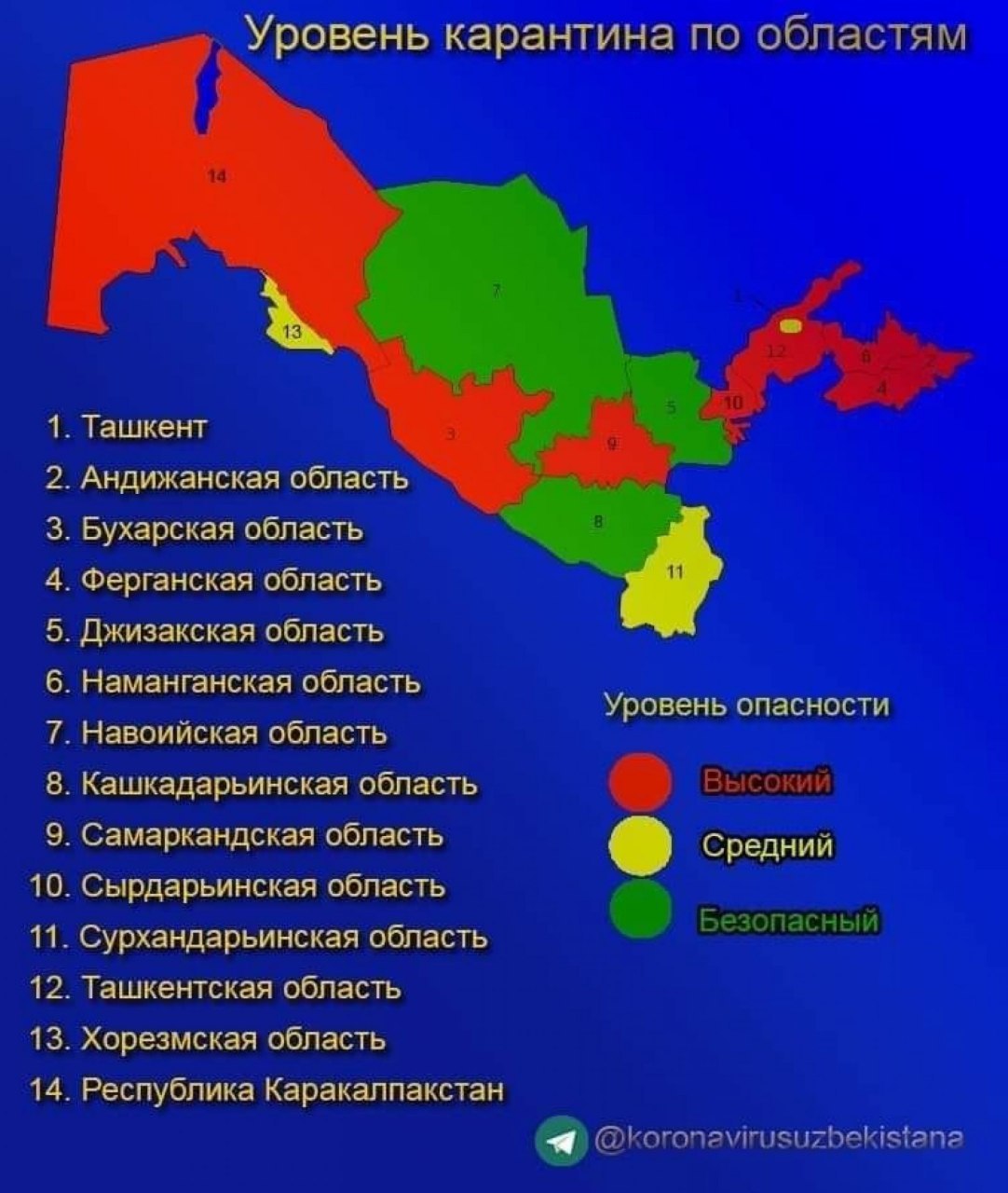 Карантинный режим с разделением на «красную», «желтую» и «зеленую» категории начнет действовать в Узбекистане с 8 мая. Красная - самая опасная. В нее вошли Каракалпакстан, Ташкентская, Андижанская, Наманганская, Ферганская, Самаркандская, Бухарская и Сырдарьинская области. Здесь не сняты никакие ограничения. Разрешено совершать прогулки возле при соблюдении социальной дистанции и ношение масок. А в зеленую - в которой нет зараженных коронавирусом лиц и нет находящихся на лечении от коронавирусной инфекции пациентов, вошли Навоийская, Джизакская и Кашкадарьинская области.