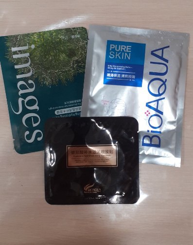 Набор тканевых масок: 2 маски для лица - с экстрактом морских водорослей, маска анти-акне, а также маска для глаз.