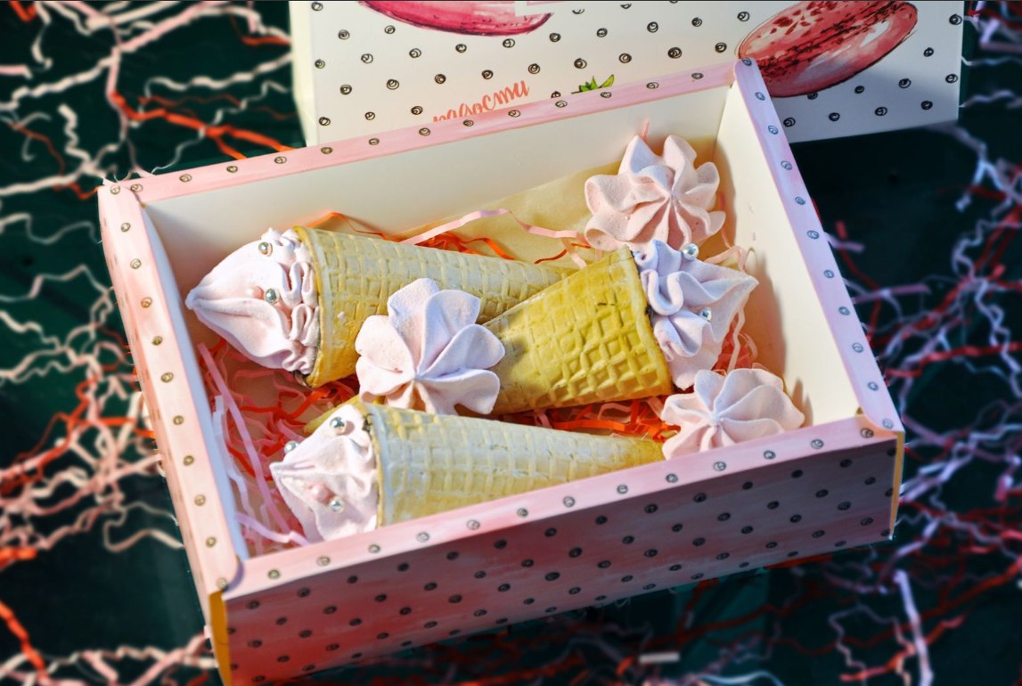 Набор зефирных рожков. В наборе 3 вафельных рожка с ванильным зефиром с добавлением чёрной смородины. Каждый вафельный рожок внутри покрыт шоколадом. Размер коробочки 20х15х5.
