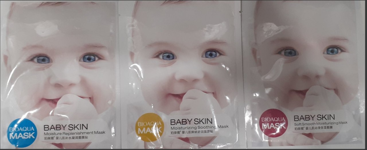 комплект масок-салфеток для лица Baby skin от Bioaqua: moisture replenishment mask (восстанавливает и увлажняет кожу), soft white moisturizing mask (осветляет и разглаживает кожу), whitening soothing mask (успокаивает и отбеливает кожу).