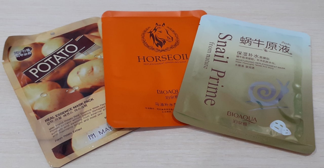 комплект косметических тканевых масок для лица: маска с муцином улитки BIOAQUA SNAIL PRIME, маска с лошадиным жиром Horse Oil Replenishment Sparkling Mask BIOAQUA, May island essence mask pack "Potato"
