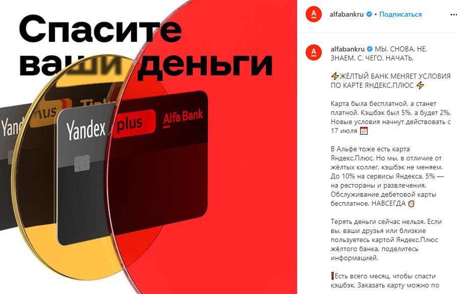 В Альфе тоже есть карта Яндекс.Плюс. Но мы, в отличие от жёлтых коллег, кэшбэк не меняем. До 10% на сервисы Яндекса, 5% — на рестораны и развлечения. Обслуживание дебетовой карты бесплатное. НАВСЕГДА ✊🏻