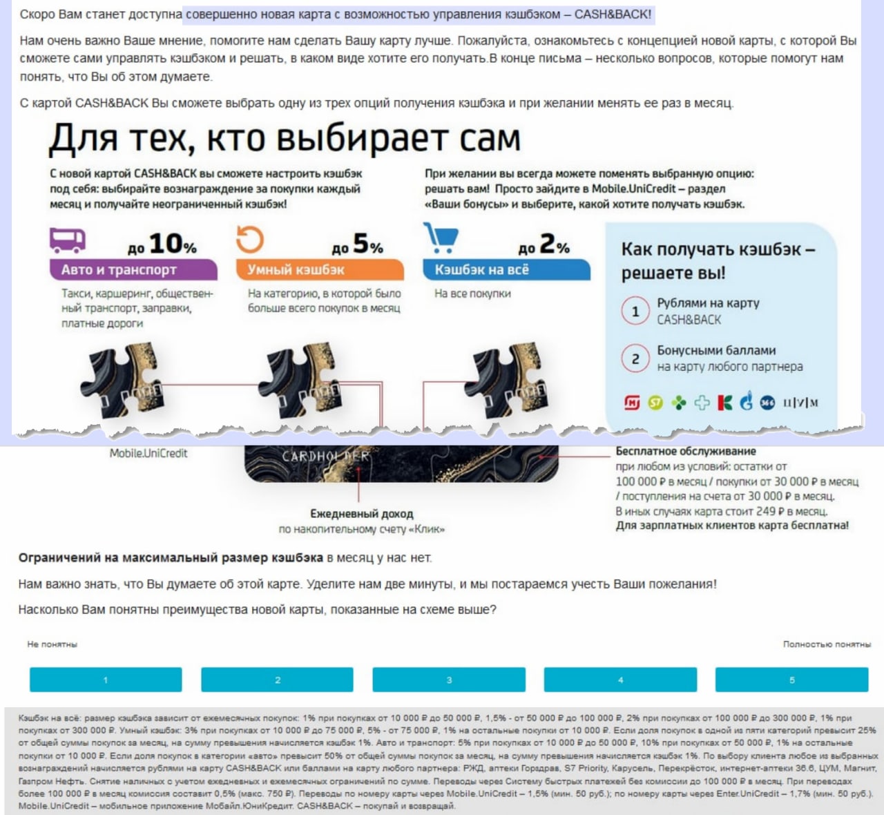 ЮниКредит в e-mail рассылке интересуется, понятны ли преимущества по карте, которая скоро будет презентована (см. скриншот).
