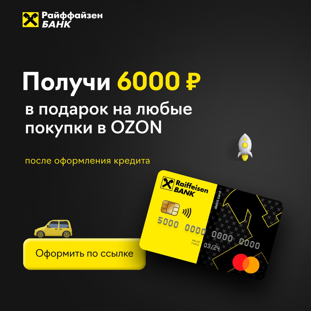 Подай заявку на кредит до 600 000 рублей по ставке от 4,99% только по паспорту и получи в подарок сертификат OZON номиналом в 6 000 рублей.