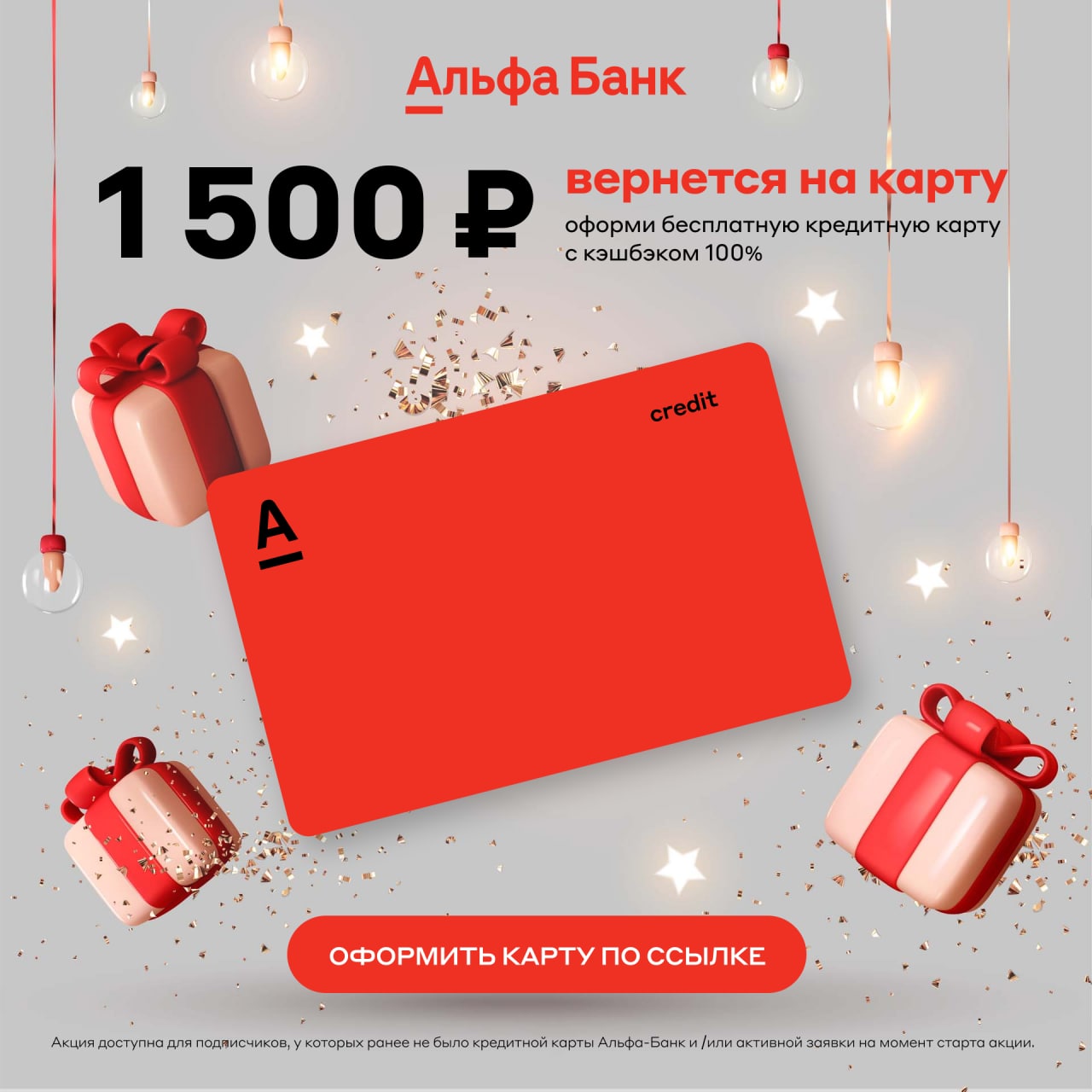 ❗️Акция доступна для подписчиков, у которых не было кредитной карты Альфа-Банк и /или активной заявки на момент старта акции и проживающих по всей РФ