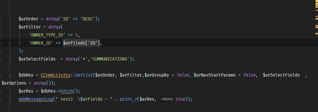 $activityList = \CCrmActivity::GetList(Проверять сначала в консоли, сразу в обработчик лучше не ставить