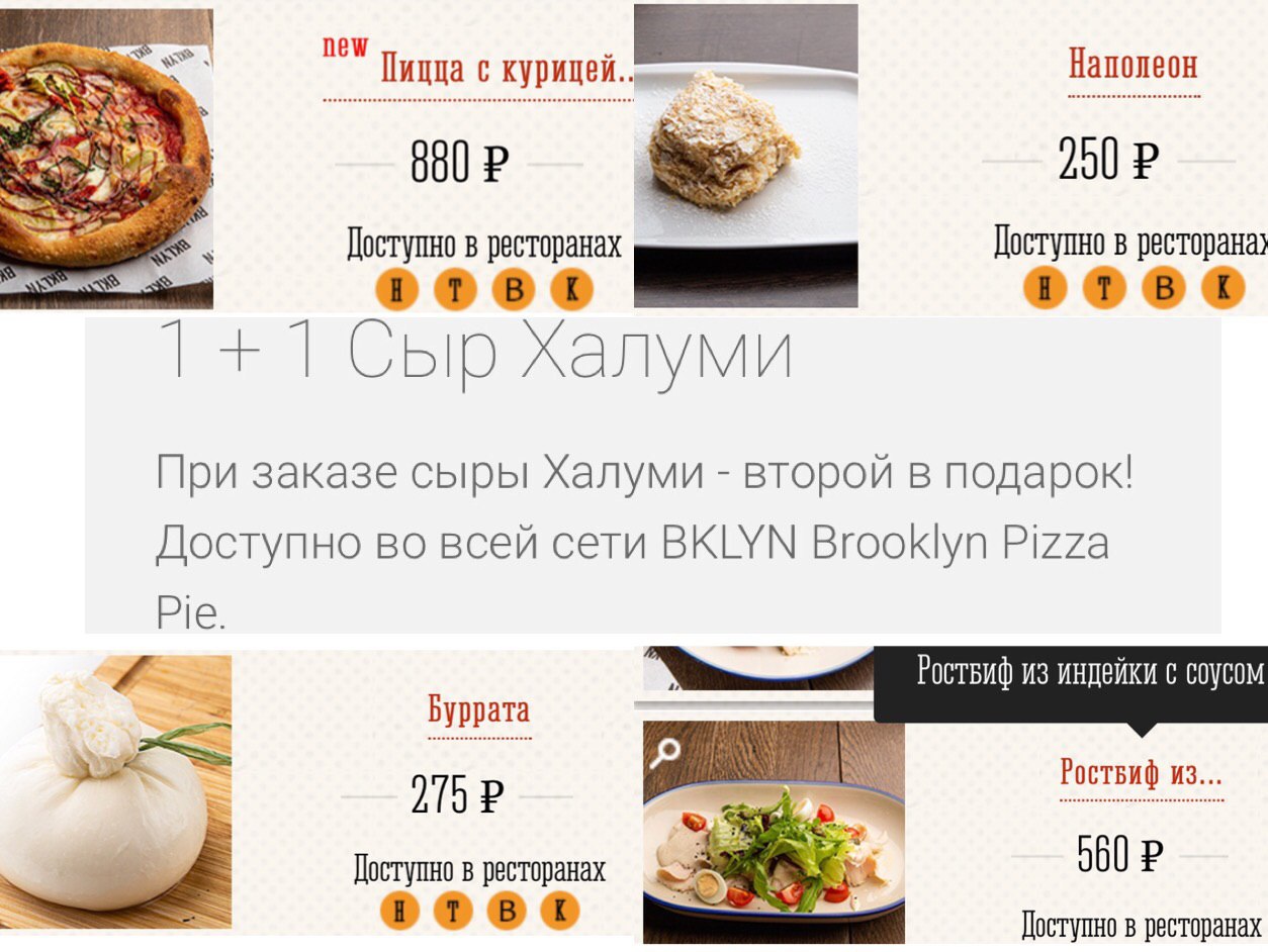 При заказе одного блюда — второе в подарок: 🔸пицца «Курица Барбекю» (880₽) 🔸Ростбиф из индейки с соусом Вителло (560₽) 🔸Сыры халуми и буррата 🔸Десерт Наполеон (250₽)