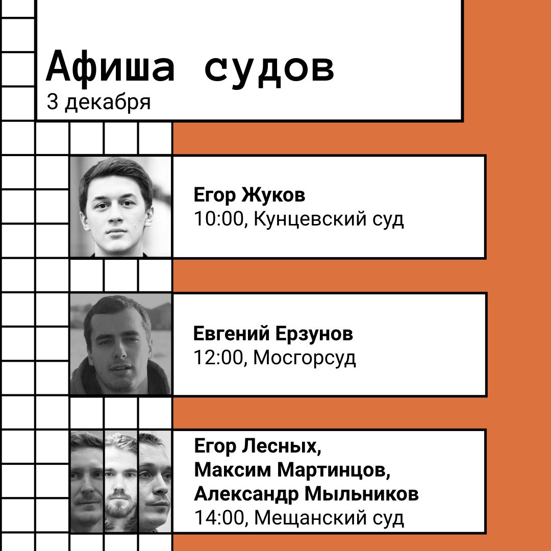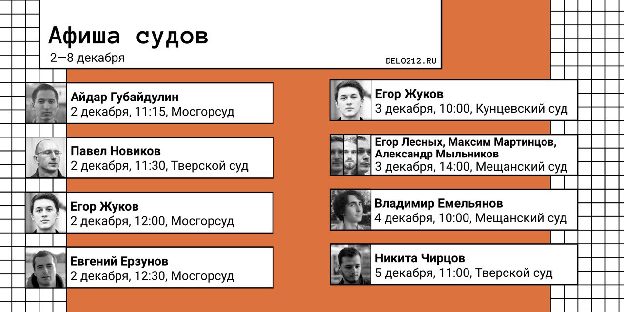 1. В понедельник пройдёт четыре судебных заседания по «делу 212» — у Айдара Губайдулина, Егора Жукова, Евгения Ерзунова и Павла Новикова