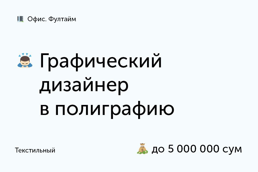 В полиграфию ABC Poligrafiya & Design Co. требуется графический дизайнер с навыками для работы в оперативной полиграфии. Опыт работы не важен.