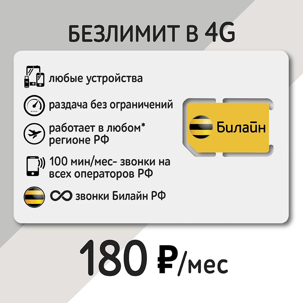 ・Безлимитный интернет Beeline 4G + 100 мин - 180 р/месяц