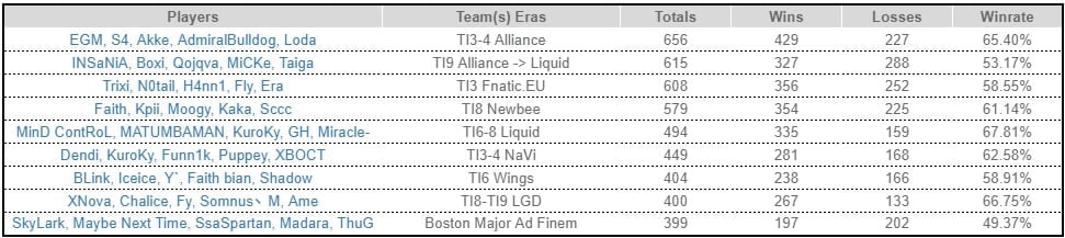 Текущий ростер Team Liquid обогнал состав Fnatic времен The International 2013 (олды тут?) и вышел на второе место в списке самых стабильных составов. Команда сыграла 615 игр с винрейтом 53,17%. Лидирует Alliance образца TI3 (656 игр с винрейтом 65,40%).