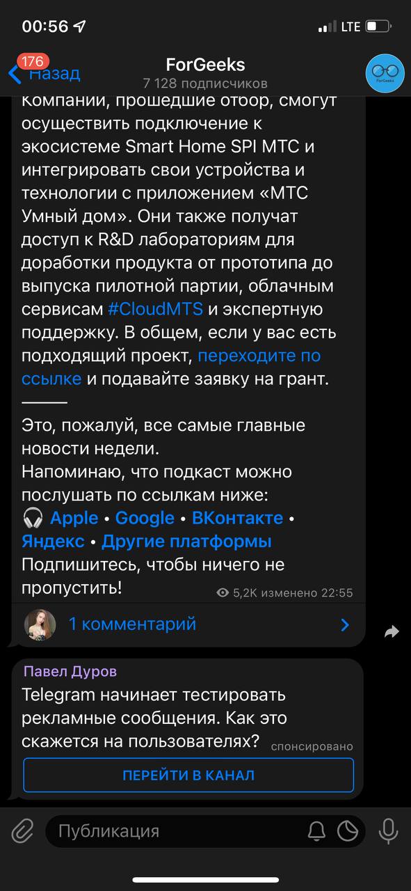 Но ненавязчивая. Только в каналах (да, видимо, и в нашем тоже). И только основанная на тематике каналов. То есть, ваши данные собирать не будут. Дуров заявил, что большинство пользователей едва ли вообще заметят изменения. Впрочем, кажется, это лишь начало.