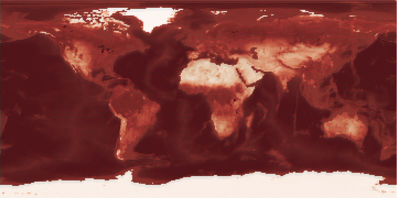 Возьмем ETOPO2, WTB и полигональную сетку. Для каждого полигона рассчитаем координаты центроида, добавим в таблицу зональную статистику по трем каналам и медианную высоту полигона. Нормализуем все к общему диапазону, а после значения каналов используем вместо координат, а значениями координат определим яркости пикселов. По всем здравым рассуждениям на выходе должна получиться шумная ерунда, словно помехи в телевизоре. Но на самом деле вы увидите знакомые очертания континентов.