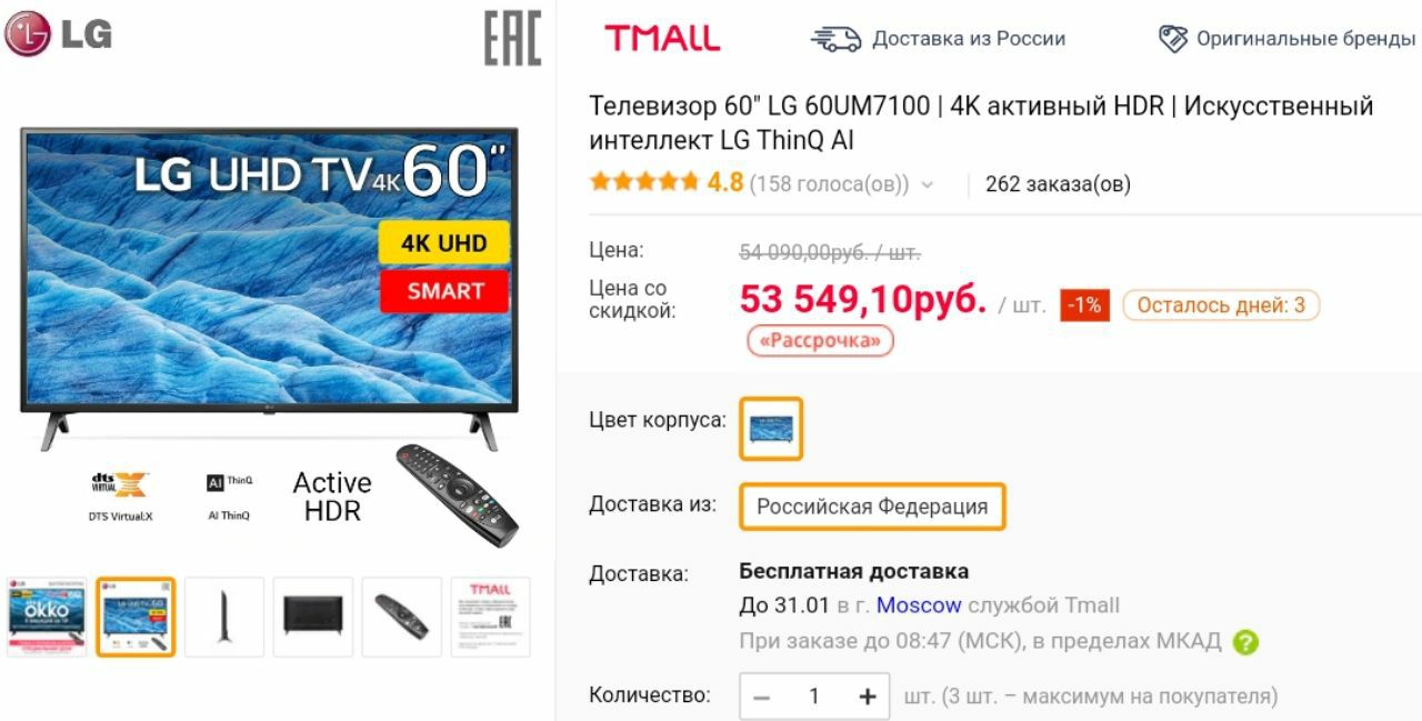 Беру! – лучшая цена на телевизор LG 55UK6300 4K 54.6"!Здесь его можно купить за 32 990₽, когда цена везде от 37 990₽. Хороший ценник за такое разрешение и диагональ.