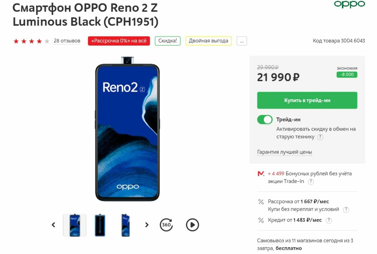 ▪️М.Видео - смартфон OPPO Reno 2 Z Luminous Black за 21990₽!